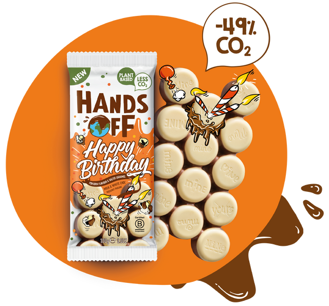 Mach jeden Tag zu deinem Geburtstag! Mit der veganen Schokolade Hands Off Happy Birthday genießt du eine unwiderstehliche Kombination aus pflanzlicher Milchschokolade, weißer Schokolade, knusprigem Popcorn und zartem Karamell – für ein Geschmackserlebnis, das sofort Glücksgefühle auslöst. 🥳✨